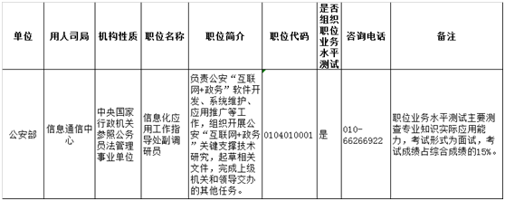 在2019年中央机关遴选选调公务员考试中,公开遴选处级干部13人,其中有4个机关6个岗位设置了职位业务水平测试,占所有遴选岗位的46%。在2019年中央机关遴选和选调公务员考试中,有42个机关计划遴选主任科员及以下公务员334名,其中有25个机关84个岗位设置了职位业务水平测试,占所有遴选岗位的25%。公安部信息通信中心需要进行职位业务水平测试,主要测查专业知识实际应用能力,考试形式为面试,考试成绩占综合成绩的15%。
