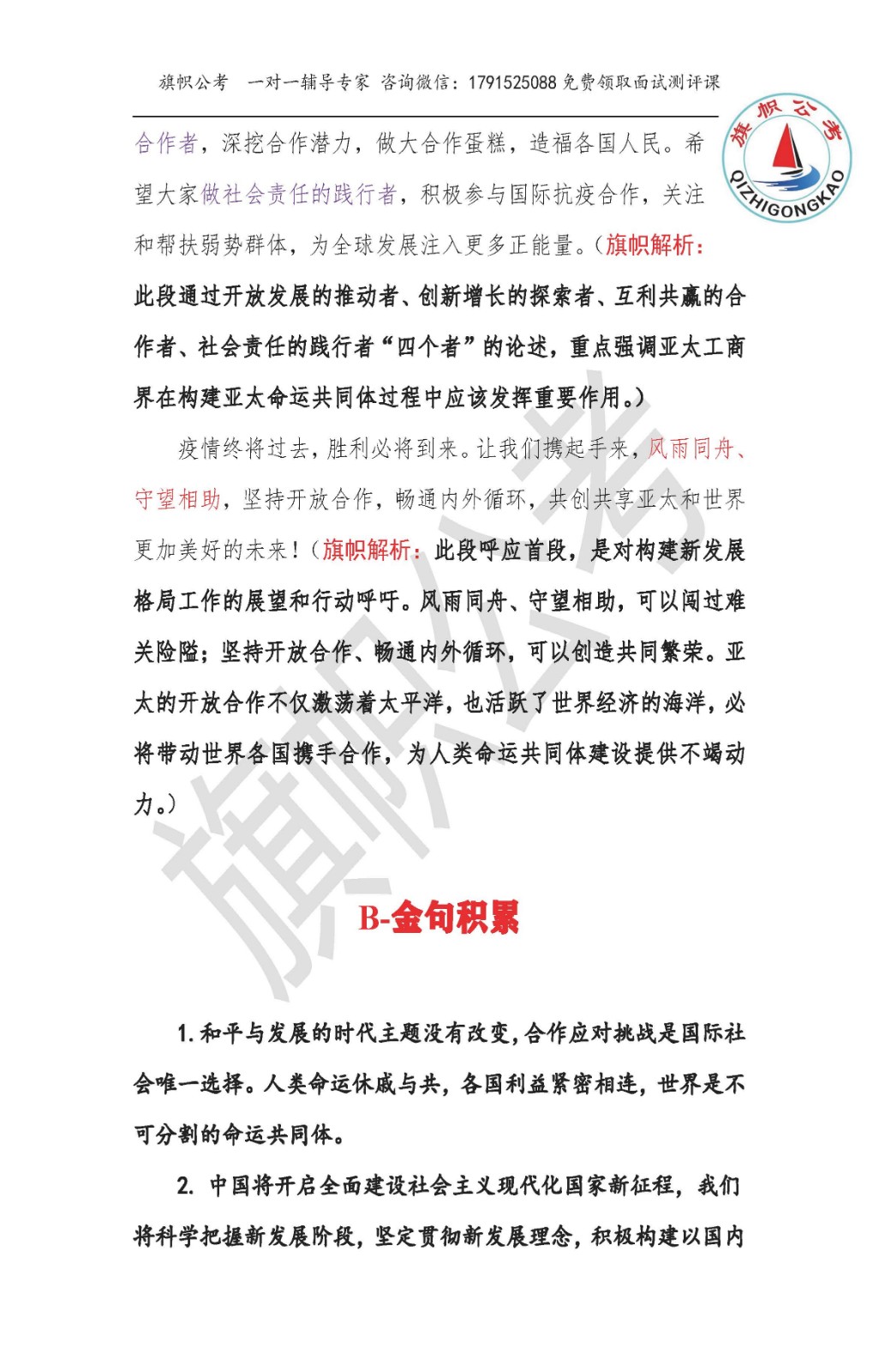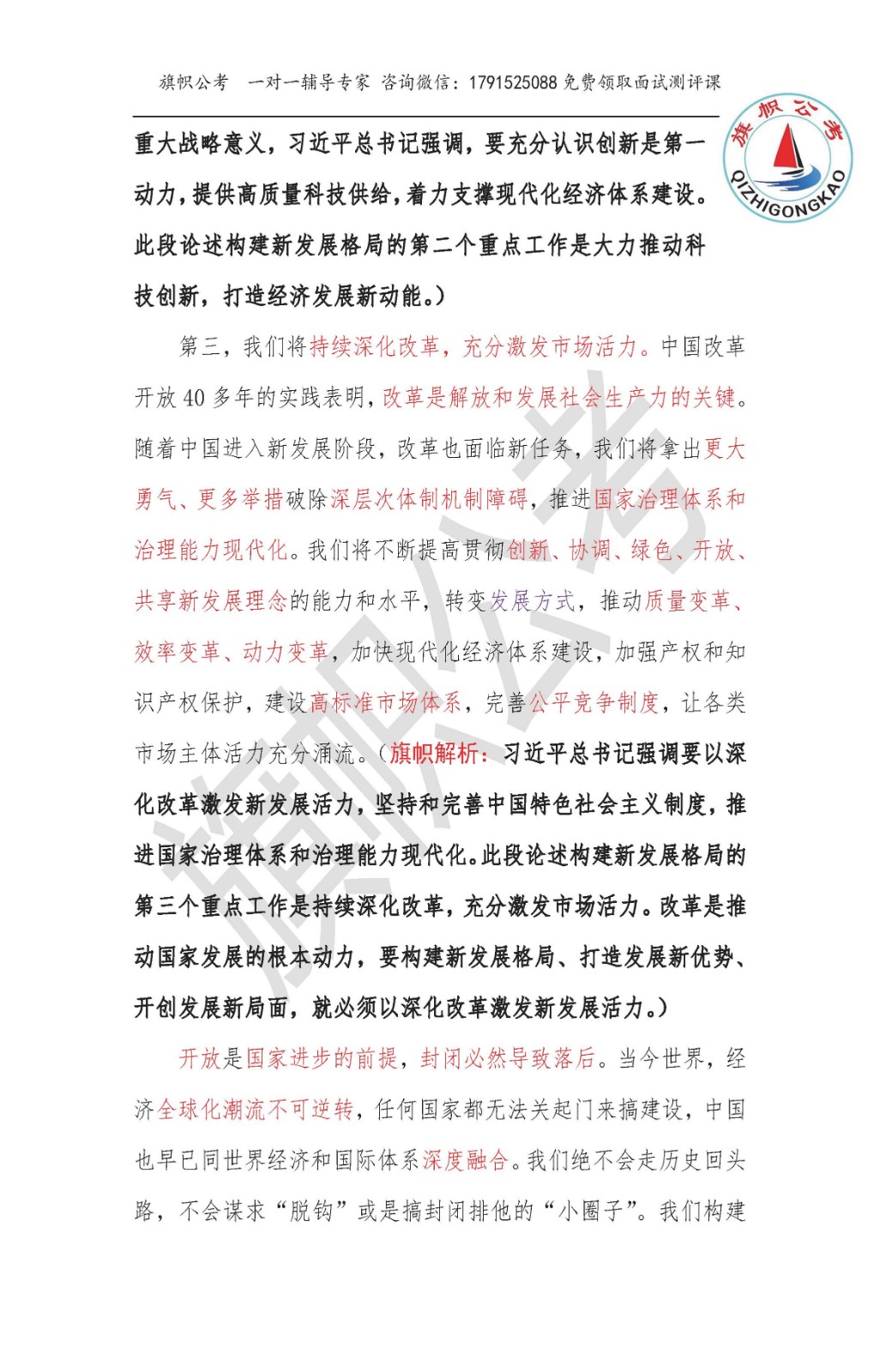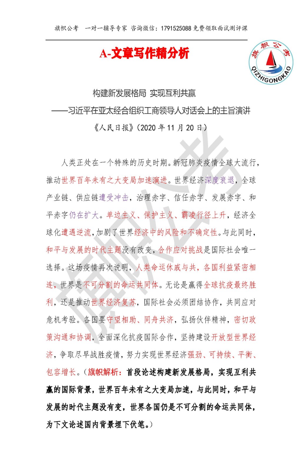 旗语:“察势者智,驭势者赢。”习近平总书记11月19日出席亚太经合组织工商领导人对话会并发表主旨演讲,强调世界是不可分割的命运共同体,要全面深化抗疫国际合作,推动世界经济复苏。中国经济发展稳中向好、长期向好的基本面没有变。我们将科学把握新发展阶段,坚定贯彻新发展理念,积极构建新发展格局。中国早已同世界经济和国际体系深度融合。我们构建新发展格局,绝不是封闭的国内单循环,而是开放的、相互促进的国内国际双循环。在新发展格局下,中国市场潜力将充分激发,为世界各国创造更多需求。在新发展格局下,中国开放的大门将进一步敞开,同世界各国共享发展机遇。在新发展格局下,中国的对外合作将不断深化,同世界各国实现互利共赢。文章是习近平总书记的讲话稿,论述重点突出,逻辑清晰,论据翔实,其中的很多重要表述可以进行关注和积累使用。